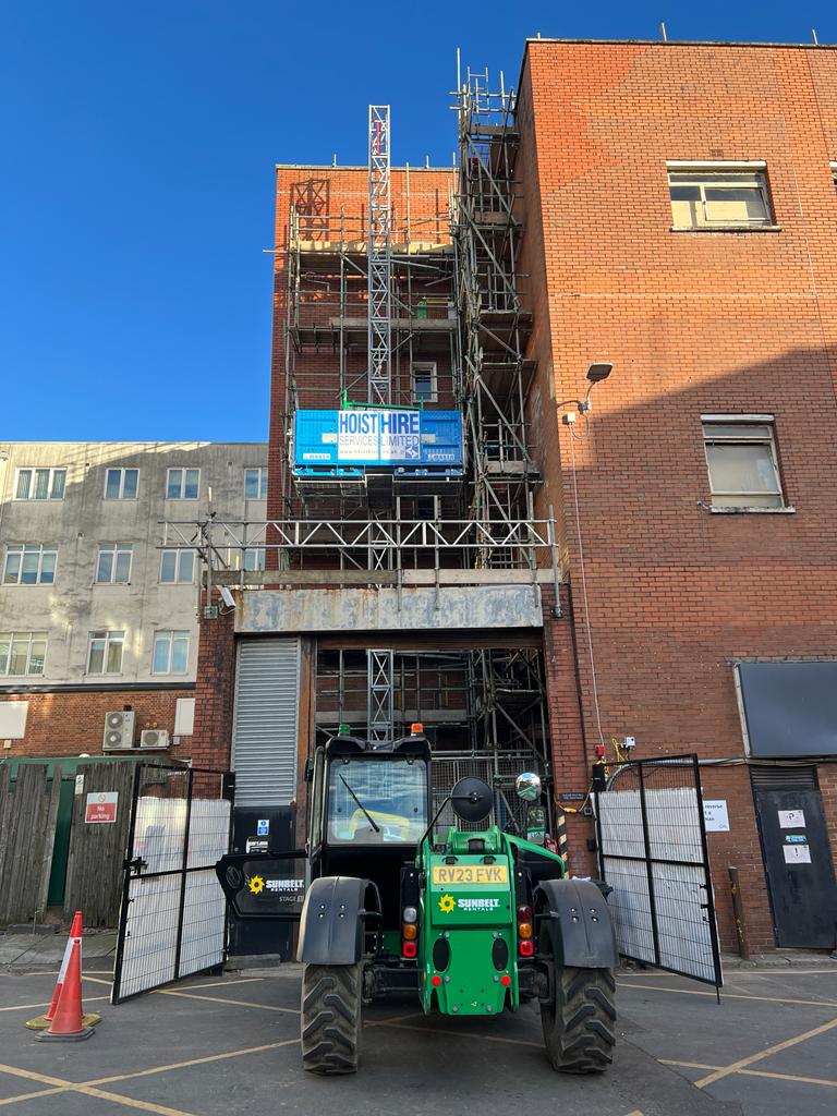 The Maber MBC2000 goods hoist was chosen as this has full width loading from the side enabling site to load MEWPs and palletised materials for distribution to all floors of the project. It also was the largest hoist that could be squeezed in to the original loading bay, another of the site constraints that had to be overcome.